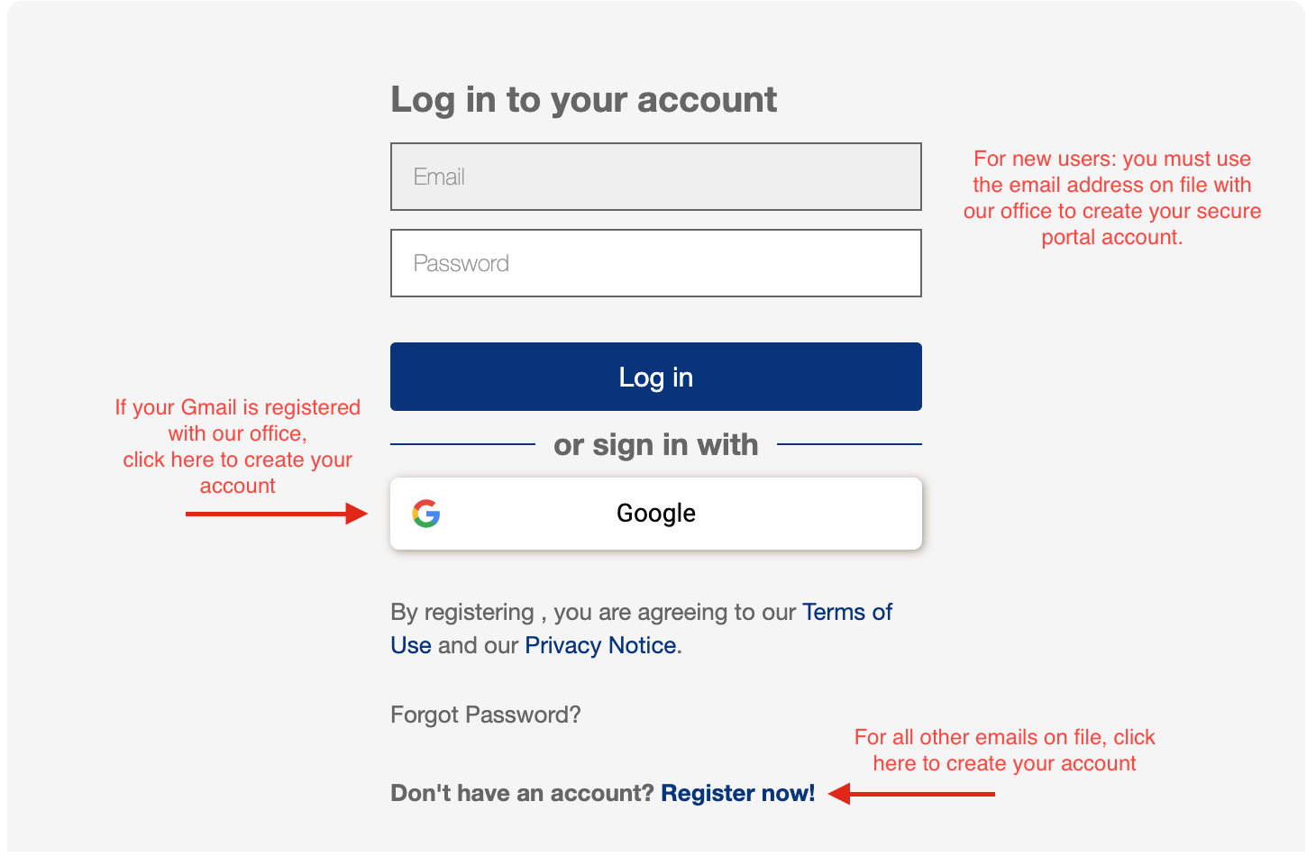 We may have an inactive email address on file that is now forwarded to a new active email address. This can create confusion because you will receive our messages but your new email address will not work to set up your account. If you are not sure which email address you have on file at our office please send an email to office@seadds.com from the email you would like to use for your secure patient portal. In the subject line write “Email Verification”. In the body of the email write “Update my email address in your system.” After we update you address on file, we will respond to your email with “Verified.” After you receive this message, proceed with creating your account.